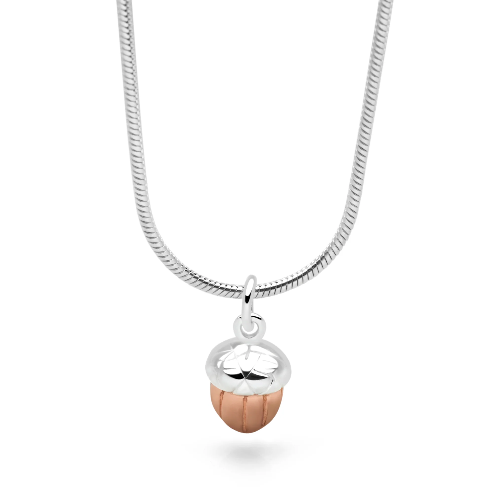Celebrate the cozy charm of autumn with this beautifully crafted sterling silver acorn pendant, featuring a warm rose gold-plated nut nestled beneath a polished silver cap. Symbolizing new beginnings, strength, and quiet growth, the acorn is a timeless token of nature’s wisdom.