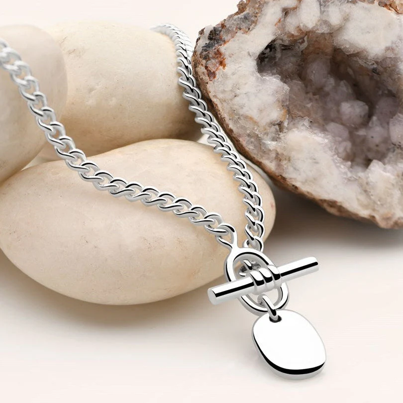 The Issimo necklace is a dramatic statement piece, with melted silver lozenges that dangle beautifully from a delicate yet sturdy chain. This chunky silver necklace features a unique T-bar clasp, offering versatility with two ways to wear it: highlight the intricate details at the back for a subtle look, or spin it around to make the clasp and liquid lozenge tab the focal point.